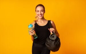Positive Sporty Girl Holding Bag, Mat And Water, Yellow Background